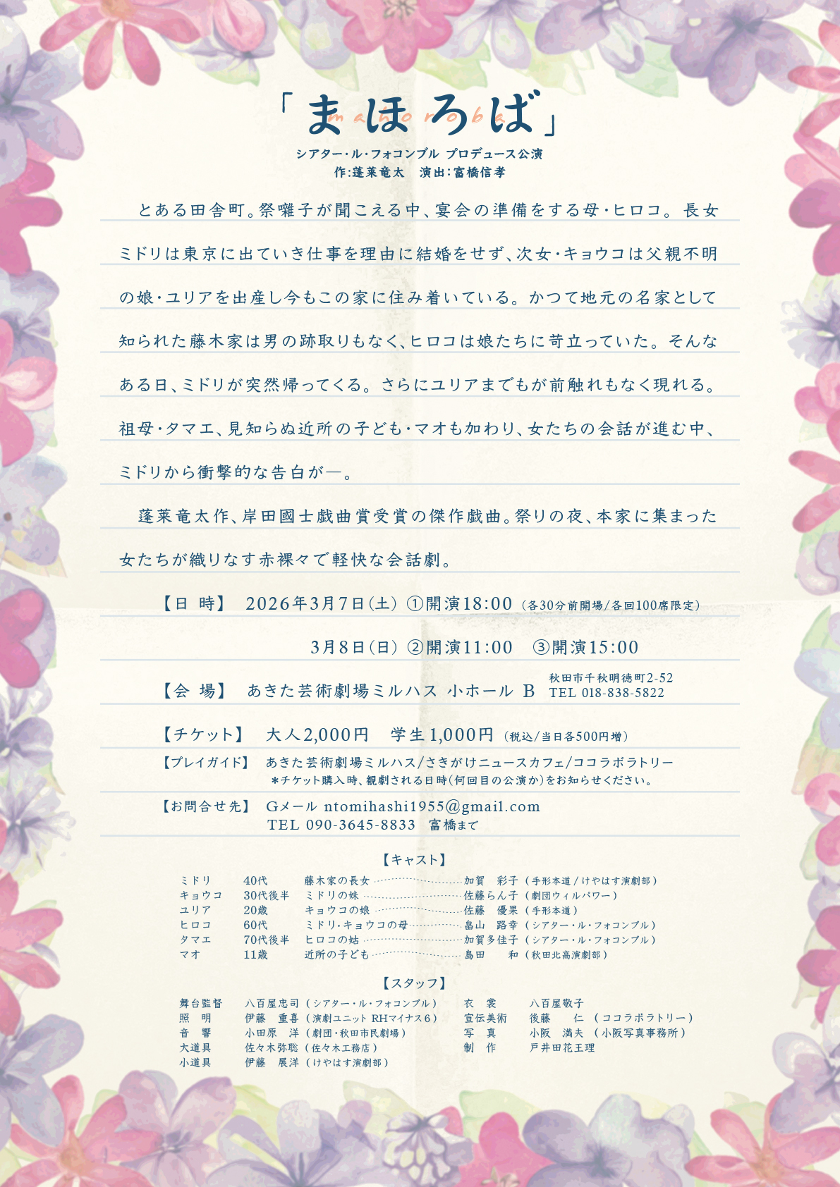 1984年に結成された、秋田市の劇団「シアター・ル・フォコンブル」の公演「まほろば」の宣伝美術を担当しました。役者さんの存在が引き立つ会話劇。この週末はぜひ演劇に!